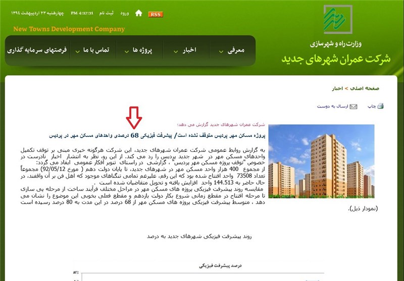 در حالی شرکت عمران شهرهای جدید ایران پیشرفت فیزیکی پروژههای مسکن مهر پردیس را 68 درصد اعلام کرده که مدیرعامل شرکت عمران این شهر میزان پیشرفت فیزیکی را 62 درصد اعلام کرده است. پس از انتشار گزارشی در خصوص وضعیت پروژههای مسکن مهر پردیس، شرکت عمران شهرهای جدید ایران اعلام کرد پیشرفت فیزیکی پروژههای طرح مهر این شهر 68 درصد است.