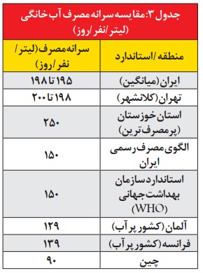 اين سرانه مصرف بالا زماني نگرانكنندهتر ميشود كه با استانداردهاي جهاني مقايسه شود. سرانه مصرف ۱۹۵ ليتري ايران بهطور قابل توجهي بالاتر از كشورهاي توسعهيافته و پرآبي مانند آلمان (۱۲۹ ليتر در روز)، فرانسه (۱۳۹ ليتر) يا حتي استاندارد ۱۵۰ ليتري سازمان بهداشت جهاني (WHO) است. اين در حالي است كه ايران كشوري واقع در كمربند خشك جهان با متوسط بارندگي يكسوم ميانگين جهاني است.