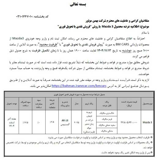 به گزارش ایرانجیب ، شرکت بهمن موتور با انتشار بخشنامه ای، شرایط فروش مزدا ۳ را با قیمت قطعی برای بهمن ماه ۱۴۰۴ اعلام کرد. متقاضیان می‌توانند از ساعت ۱۰ صبح روز دوشنبه مورخ ۱۳ بهمن تا ساعت ۱۶ همان روز یا تا تکمیل ظرفیت، نسبت به ثبت نام و واریز وجه اقدام نمایند.