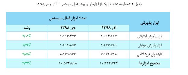 از سویی دیگر، با توجه به رشد ابزار پذیرش اینترنتی و موبایلی به ترتیب ۲.۰۳ و ۱.۲۶ درصد، تعداد ابزارهای پذیرش اینترنتی و موبایلی فعال سیستمی به یک میلیون و ۱۱۶ هزار و یک میلیون و ۲۹۲ هزار پایانه رسیده است؛ بر همین اساس، مجموع تعداد ابزارهای پذیرش فعال سیستمی در شبکه پرداخت الکترونیک تا پایان دی ماه به ۱۰ میلیون و ۵۷۴ هزار و ۸۹۸ پایانه افزایش داشته که نسبت به آذر ماه رشدی ۲.۲۲ درصدی را تجربه کرده است.