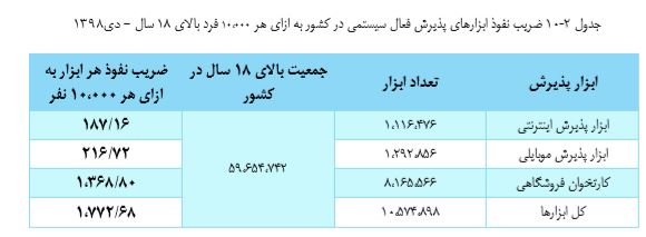 بر اساس جدول فوق، ضریب نفوذ کارتخوان فروشگاهی به ازای هر ۱۰ هزار نفر فرد بالای ۱۸ سال با توجه به جمعیت ۵۹ میلیون و ۶۵۴ هزار و ۷۴۲ نفری و تعداد ۸ میلیون و ۱۶۵ هزار دستگاه پایانه فروش فعال سیستمی تا پایان دی ماه بالغ بر  یک هزار و ۳۶۸ کارتخوان به ازای ۱۰ هزار نفر است. همچنین ضریب نفوذ ابزار پذیرش اینترنتی و موبایلی به ازای هر ۱۰ هزار نفر در مدت مذکور با توجه به تعداد یک میلیون و ۱۱۶ هزار پایانه اینترنتی و یک ملیون و ۲۹۲ هزار پایانه موبایلی به ترتیب ۱۸۷ و ۲۱۶ ابزار پذیرش به ازای ده هزار نفر اعلام شده است.